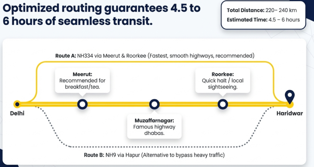 The distance between Delhi and Haridwar is approximately 220–240 km, making it an ideal road trip destination.