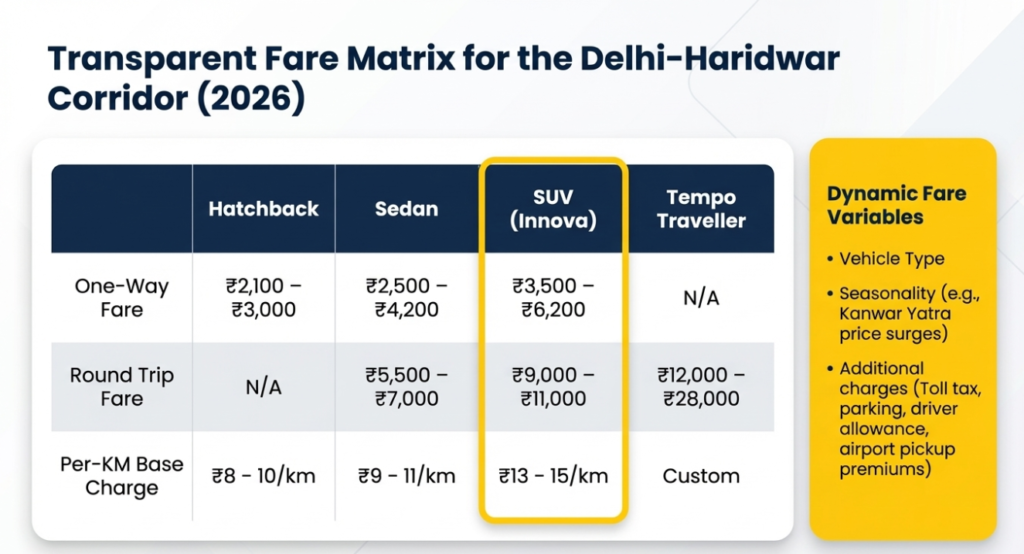 A taxi from Delhi to Haridwar can cost anywhere between ₹2,100 to ₹10,000+, depending on your vehicle choice and travel plan.